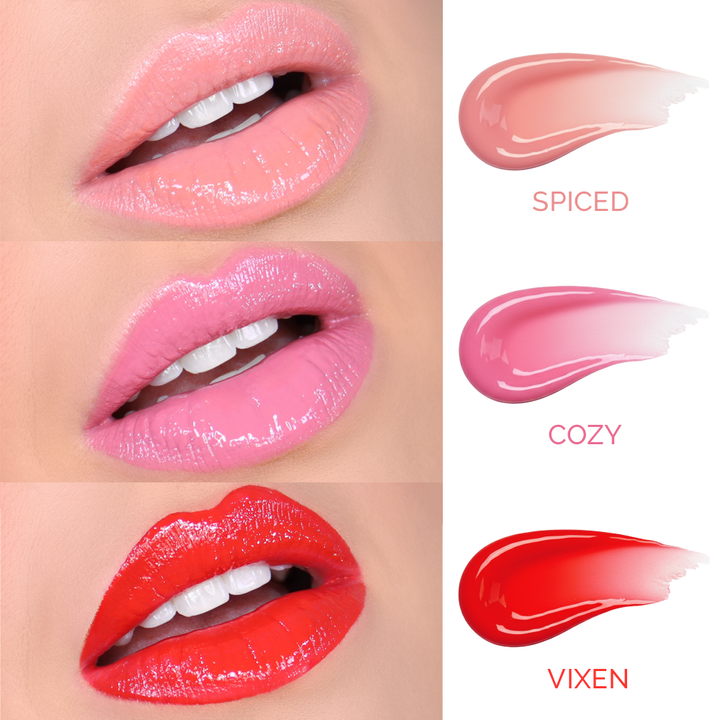 Three luxurious, high-shine lip glazes in nude, pink, and red with a rich, highly pigmented hybrid formula infused with Jojoba Oil, Macadamia Oil, Vitamin E, and Peptides. -