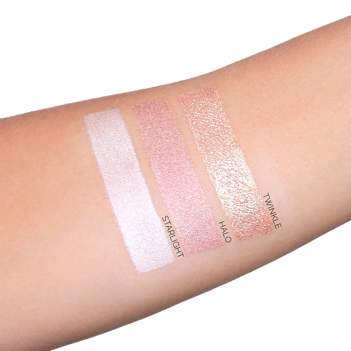 - Halo – A warm champagne bronze that melts beautifully into the skin, adding a sun-kissed, luminous glow. Perfect for medium to deep skin tones or anyone who loves a golden, just-back-from-vacation highlight. The finely milled shimmer catches the light for a smooth, radiant, candlelit finish.