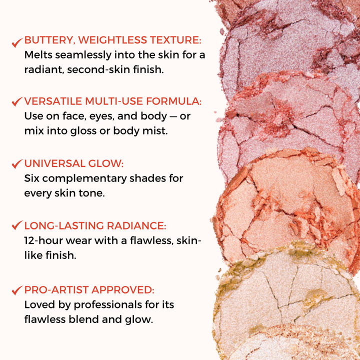 Highlight and enhance with six buttery-rich shimmer shades for radiant, luminous skin.