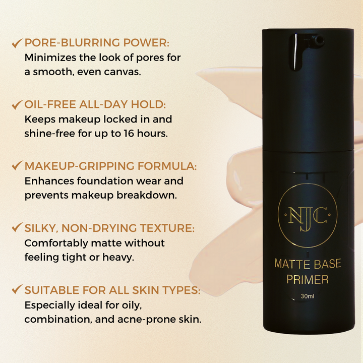 Introducing our Matte Base Primer. This innovative formula instantly minimizes pores, smoothes skin texture and controls shine for all day perfect makeup wear. The formula activates to create a seamless base to grip your makeup and create an airbrushed finish.